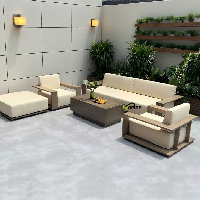 5. Udendørssofa af teak: Lavet af meget vejrbestandigt naturligt teaktræ, denne sofa kan prale af et fint korn, høj stabilitet og udvikler en mere luksuriøs følelse ved brug, hvilket gør den til et klassisk valg til at skabe en luksus altan i resort-stil.