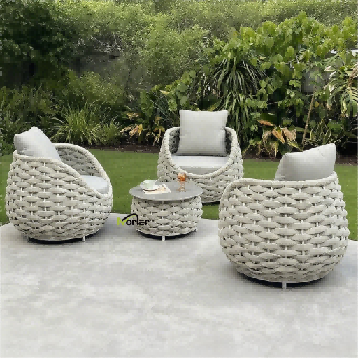 4.Rope Outdoor Sofa: Det håndflettede rebdesign er visuelt let og åndbart, og aluminiumsrammen tilføjer et moderne touch. Ved at kombinere komfort og kunstnerisk er det et populært valg til at skabe en sofistikeret altan.